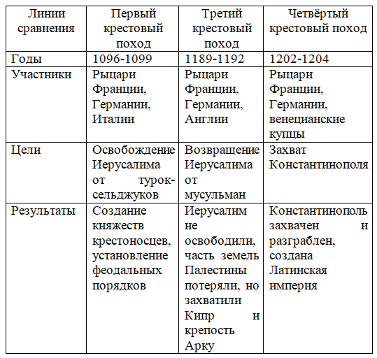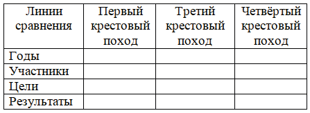 Сопоставьте указанные Крестовые походы по линиям сравнения.