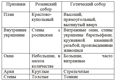 1. На основании текста и иллюстраций составьте рассказ о романских и готических соборах. 2. Разработайте таблицу для сопоставления романского и готического соборов по отдельным частям их плана, архитектурным элементам, внутреннему убранству. 3. Какие мысли и чувства стремились выразить в своих произведениях средневековые архитекторы и скульпторы? Какими средствами они этого достигали? 4. Каков был эффект от использования витражей в готическом храме? 5. Что нового внесло позднее Средневековье в книжную миниатюру и фресковую живопись?