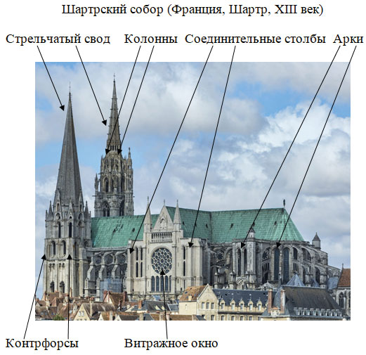 Готический собор имеет лёгкий и высокий стрельчатый свод, который опирается внутри на пучки узких, высоких колонн, а снаружи - на массивные опорные столбы и соединительные арки. Залы просторные и высокие, в них поступает больше света и воздуха, они богато украшены живописью, резьбой, барельефами. Благодаря широким проходам и сквозным галереям, большому количеству огромных окон и кружевной каменной резьбе готические соборы кажутся прозрачными. Повторяющиеся очертания стрельчатой арки, круглые скаты крыш, высокие башни колоколен - всё создаёт впечатление стремительного порыва ввысь.