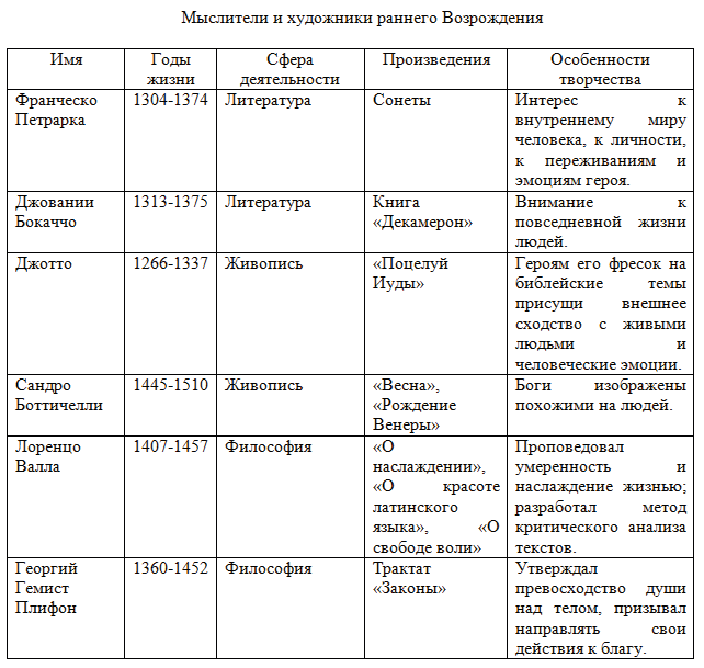 Материал о философах взят из дополнительных источников, поскольку в параграфе нет никакой информации о философах, а задание предполагает внесении информации о мыслителях раннего Возрождения.