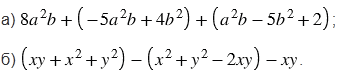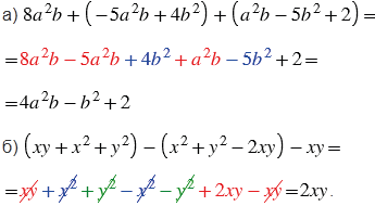 Чтобы упростить выражения, нужно раскрыть скобки и привести подобные слагаемые (в решении выделены одинаковым цветом). Подобные слагаемые, которые в сумме дают ноль, вычеркнуты.