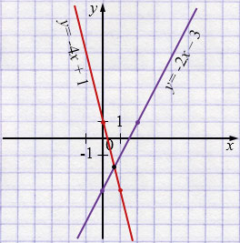 Постройте графики функций \(y=-4x+1\) и \(y=2x-3\) и найдите координаты точки их пересечения. Ту же задачу решите без построения графиков. Сравните полученные ответы.