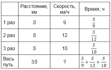 \(v_{ср.} = \frac{3S}{\frac{S}{9} ^{\color{blue}{\backslash20}} +\frac{S}{12} ^{\color{blue}{\backslash15}}+\frac{S}{10} ^{\color{blue}{\backslash18}} }=\)