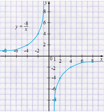 \(y=\frac{-8}{x}\) - графиком является гипербола с ветвями расположенными в II и IV координатных четвертях. Строим гиперболу по точкам, представленным в таблице.