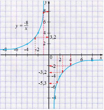 Постройте график функции, заданной формулой \(y=\dfrac{-8}{x}\). Найдите по графику:
