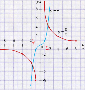 б) Чтобы решить графически уравнение \(\displaystyle \frac{8}{x} = x^3\), нужно найти точки пересечения двух графиков: