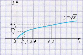 Функция \(y=\sqrt{x}\) определена при \(x\ge0\). Строим график функции по точкам.