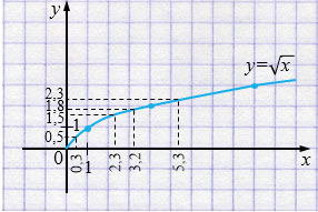 а) Чтобы найти значения функции \(y\) которые соответствуют заданным значениям аргумента \(x\) по графику функции \(y=\sqrt{x}\), через заданные значения к оси \(x\) проводим перпендикулярные прямые, эти прямые пересекут график в некоторые точках, через эти точки чертим прямые параллельные оси \(x\), которые пересекут ось \(y\) в значениях, соответствующих искомым значениям \(\sqrt{x}\).