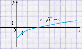 3. При построении графика учитываем область определения функции: корень существует только в том случае, когда подкоренное выражение неотрицательно. Строим график по точкам, учитывая область определения функции. Подбираем такие значения
