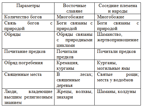 1. Когда славянские племена выделились из индоевропейских? Какие версии их происхождения и миграции вам известны? 2. Перечислите главные занятия восточных славян и назовите орудия труда, которыми они пользовались. Чем определялся характер занятий восточных славян? 3. В чём вы видите преимущество двуполья и трёхполья перед перелогом и подсечно-огневой системой? К каким последствиям приводила каждая из этих систем земледелия? 4. По иллюстрациям в учебнике и данным из Интернета опишите внешний облик восточных славян и их образ жизни. 5. Какими были религиозные верования восточных славян? Чем они отличались от верований соседних племён и народов? Результаты отразите в виде таблицы и прокомментируйте в классе.