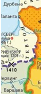 Место Грюнвальдской битвы обозначено на карте двумя черными скрещенными мечами и цифрой 1410.