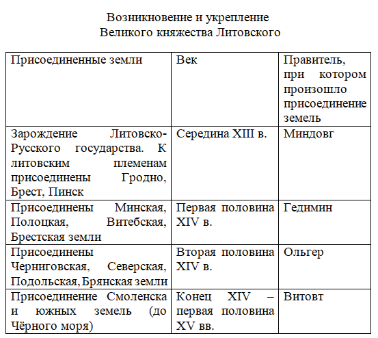 1. Составьте в тетради хронологическую таблицу "Возникновение и укрепление Великого княжества Литовского". 2. Сравните государственные порядки, существовавшие в XIV в. в Великом княжестве Литовском и на Руси. 3. Используя Интернет и дополнительную литературу, подготовьте краткую биографию одного из упомянутых в параграфе литовских князей. Ответ оформите в виде сообщения или презентации и выступите перед классом. 4. В чём состояло историческое значение вхождения части русских земель в состав Великого княжества Литовского?