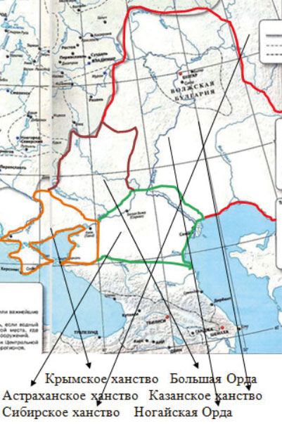 2. Государства, образовавшиеся в результате распада Золотой Орды: Крымское ханство, Астраханское ханство, Казанское ханство, Сибирское ханство, Большая Орда, Казахское ханство, Ногайская Орда.
