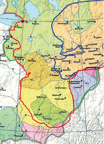 Граница Московского княжества в 1462 г. - синняя линия, в 1505 г. - красная, земли, присоединенный к 1533 г. обозначены зелёной линией.