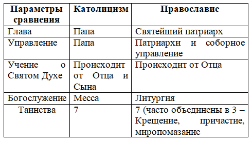 1. Какие различия в католичестве и православии вы считаете главными? Составьте схему или таблицу, отражающую эти различия.