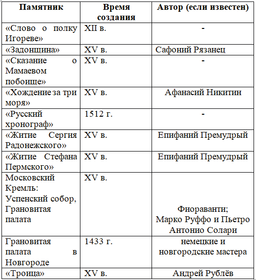1. Используя текст учебника и дополнительные источники информации сравните два произведения о Куликовской битве - "Задонщина" и "Сказание о Мамаевом побоище". 2. Используя текст учебника и дополнительные материалы, докажите, что патриотические настроения русских людей нашли своё отражение в развитии культуры. Под влиянием каких событий это произошло? 3. Завершите заполнение таблицы в тетради "Важнейшие памятники русской культуры X - начала XVI в.". 4. Почему сегодня усилился интерес населения к культурным ценностям, созданным нашими предками в далёком прошлом?