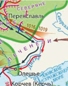 1. Найдите на карте территорию Киевской, Черниговской, Переяславской, Тмутараканской земель; половецкую степь. 2. Покажите на карте место первого крупного столкновения русских и половецких войск.