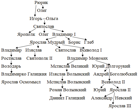 1. Используя текст учебника и Интернет, создайте родословное (генеалогическое) древо от Рюрика до черниговского князя Олега Святославича.