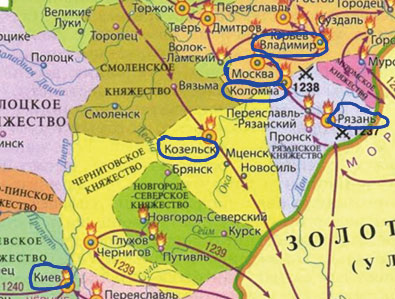 Города, оказавшие особенно ожесточённое сопротивление завоевателям: Козельск, Рязань, Коломна, Москва, Владимир, Киев.