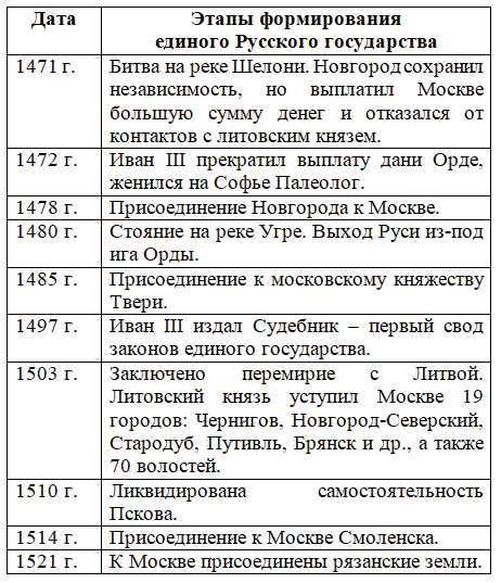 1. В чём состояло значение присоединения Новгорода к Московскому государству? 2. Как было свергнуто ордынское владычество? Каково значение этого события? 3. Как вы думаете, почему литовские правители активно вмешивались в политические события, происходившие в русских землях? 4. Составьте в тетради хронологическую таблицу, показывающую ход создания единого Русского государства. 5. Как управлялось Московское государство при Иване III? 6. Что вам известно о происхождении изображения двуглавого орла на гербе России?