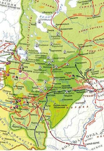 1. Покажите на карте территории, вошедшие в состав Московского государства при Иване III, при Василии III. 2. Найдите на карте города и территории, которые перешли к Русскому государству по договору 1503 г.