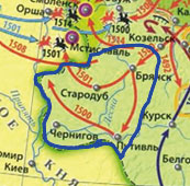 Территории, которые перешли к Русскому государству по договору 1503 г., обведены на карте жирной синей линией. Города, которые перешли к Русскому государству по договору 1503 г.: Чернигов, Путивль, Брянск, Стародуб.
