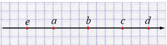 Отметьте на координатной прямой точки, имеющие координаты \(a, b, c, d\) и \(e\), если \(a < b\), \(c > b\), \(c < d\), \(a > e\).