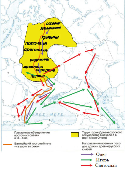 Задание 7. На контурной карте отметьте торговый путь "из варяг в греки". Заштрихуйте цветным карандашом территорию Древнерусского государства при князе Олеге. Стрелками укажите направления походов дружин древнерусских князей. Подпишите их имена.