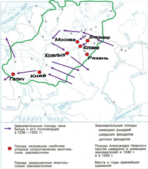 Задание 7. На контурной карте обозначьте границы русских земель, стрелками обозначьте направления движения монгольских войск. Подпишите и отметьте придуманными вами значками названия городов, оказавших наиболее упорное сопротивление завоевателям.