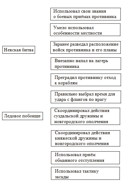 Задание 3. Проведите соединительные линии двух цветов в схеме "Полководческое искусство Александра Невского".