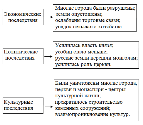 Задание 4. Заполните пропуски в схеме "Последствия монгольского нашествия для Руси".