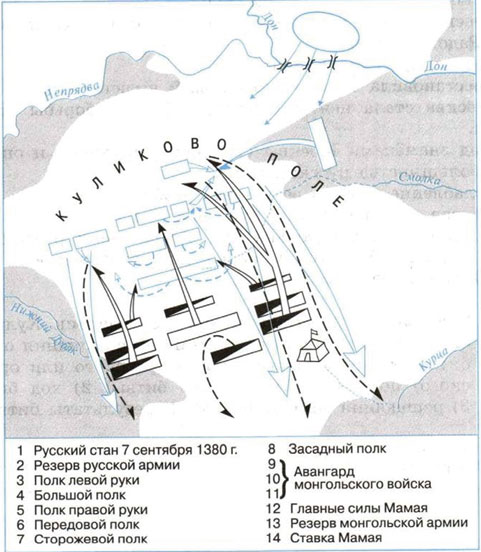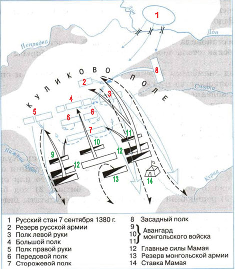 Задание 4. В схеме "Куликовская битва" расставьте соответствующие цифры, используя красный цвет для обозначения русских войск и зелёный - для обозначения монгольских войск.