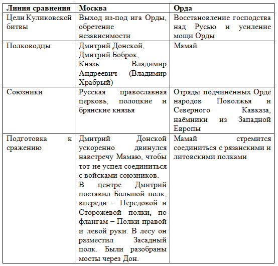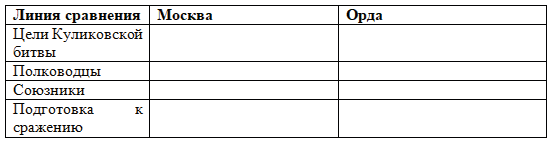 Задание 3. Заполните сравнительную таблицу "Москва и Орда накануне Куликовской битвы".