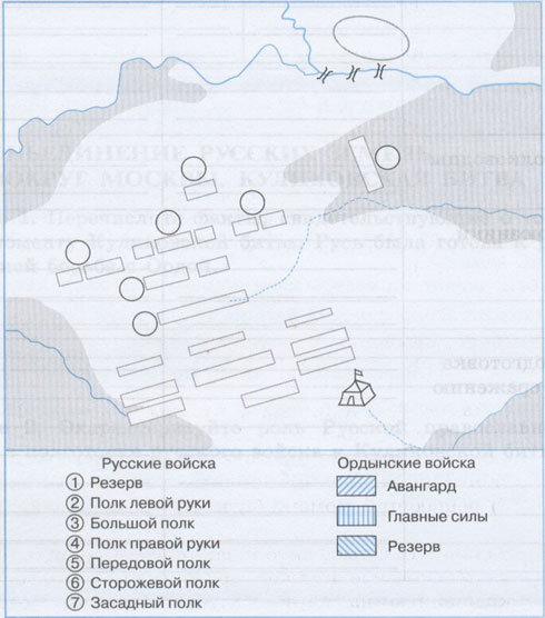 Задание 4. Подпишите названия рек и поля, на котором сосредоточены войска. Подпишите на схеме русский стан и закрасьте его красным цветом. Подпишите ставку Мамая и закрасьте её зелёным цветом. Используя информацию из легенды, соответствующими цифрами обозначьте на схеме расположение русских войск; соответствующими штриховками укажите расположение ордынских войск. Стрелками покажите направления действий русских (красным цветом) и ордынских (зелёным цветом) войск.