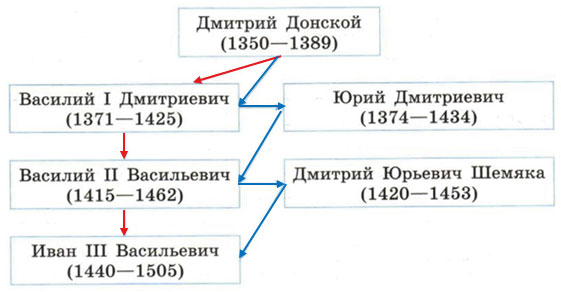Задание 2. В схеме "Столкновение двух принципов престолонаследия" обведите красным цветом стрелки между именами князей при передаче престола по наследственному принципу, синим - по принципу старшинства (в скобках указаны годы жизни князей).