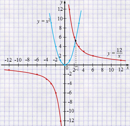 \(y=\frac{12}{x}\) и \(y = x^2\), где