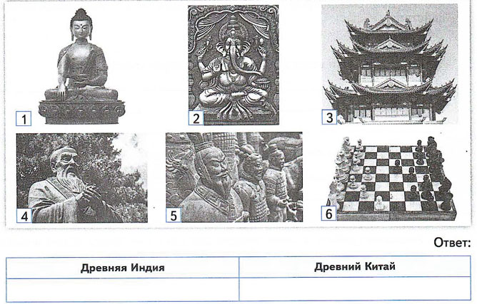 1. Определите, какие изображения связаны с историей Древней Индии, а какие относятся к истории Древнего Китая. Запишите в таблицу номера выбранных ответов.