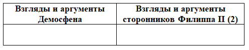 4. Сравните взгляды и аргументы Демосфена и сторонников Филиппа II (2) и запишите их в таблицу.