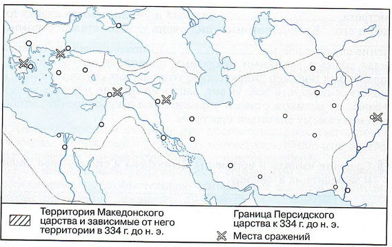 1) Соответствующей штриховкой обозначьте территорию Македонского царства и территории, зависимые от него. Подпишите название его столицы.