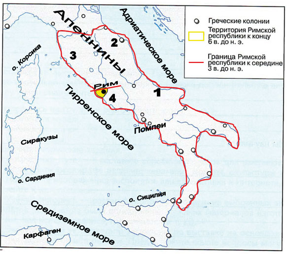 5) Обведите красным цветом границы Римской республики к середине III (3) в. до н. э.