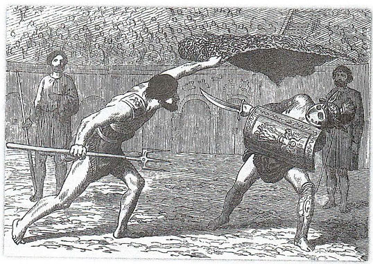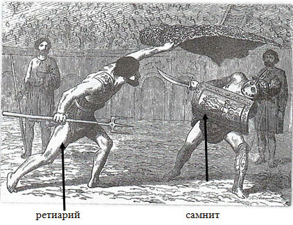 2. На рисунке изображены два гладиатора: ретиарий и самнит. Определите, кто из них ретиарий. Объясните свой ответ. Сделайте выноски на рисунке и подпишите воинов.