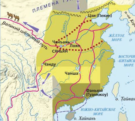 2. Китай в древности выделен жёлтым цветом. Великий шёлковый путь берет начало в городах Чанъань и Лоян.