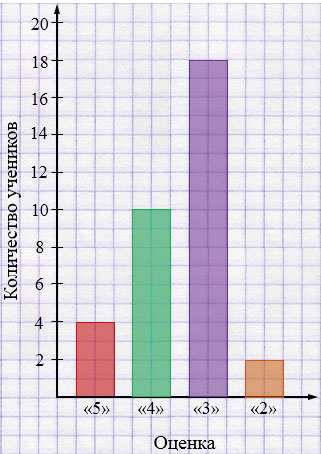 Для построения столбчатой диаграммы по данным в условии необходимо изобразить четыре столбца, высоты которых равны количеству учеников, получивших соответствующие оценки: