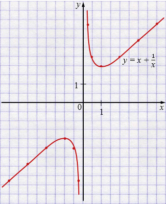 Функция \(y = x + \dfrac{1}{x}\) — это сумма линейной функции \(y = x\) и обратной пропорциональности \(y = \dfrac{1}{x}\).