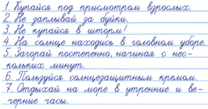 7. Выполняем задание Мудрой Черепахи. Используя текст учебника (с. 131), составляем памятку, которая поможет сделать отдых у моря безопасным. Если будем отдыхать у моря, обязательно будем соблюдать эти правила.