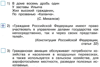 1. Отметьте знаком "+" текст, в котором слово "гражданин" или однокоренные с ним слова имеют то значение, о котором вы узнали из учебника. Объясните (устно) значение слов в двух других случаях.