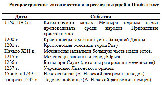 2. Составьте в тетради хронологическую таблицу "Распространение католичества и агрессия рыцарей в Прибалтике".