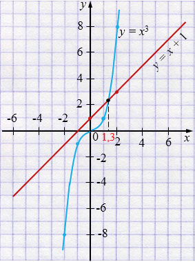Используем графический способ при решении уравнений. Для этого строим график функции \(y = x^3\) и график линейной функции, стоящей в правой части уравнения. Абсциссы (координаты \(x\) ) точек пересечения этих графиков являются корнями рассматриваемого уравнения.