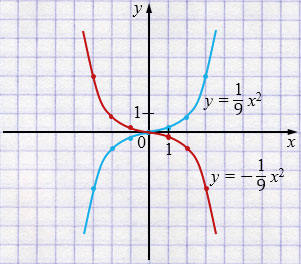 Постройте в одной системе координат графики функций \(y=\dfrac{1}{9}x^{3}\) и \(y=-\dfrac{1}{9}x^{3}\). Найдите промежутки возрастания и убывания для каждой функции.