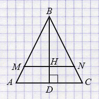 Треугольники \( MBN\) и \(ABC\) подобны по двум углам (\(\angle B\) - общий, \(\angle A = \angle {BMN}\), как соответственные углы при пересечении параллельных прямых \(AC\) и \(MN\) секущей \(AM\)). В подобных треугольниках сходственные стороны пропорциональны, поэтому \(\frac{MN}{AC} = \frac{BH}{BD}\). Откуда, учитывая то, что \(MN = y\), \(BH = x\), \(AC = 6\), \(BD = 4\), имеем: